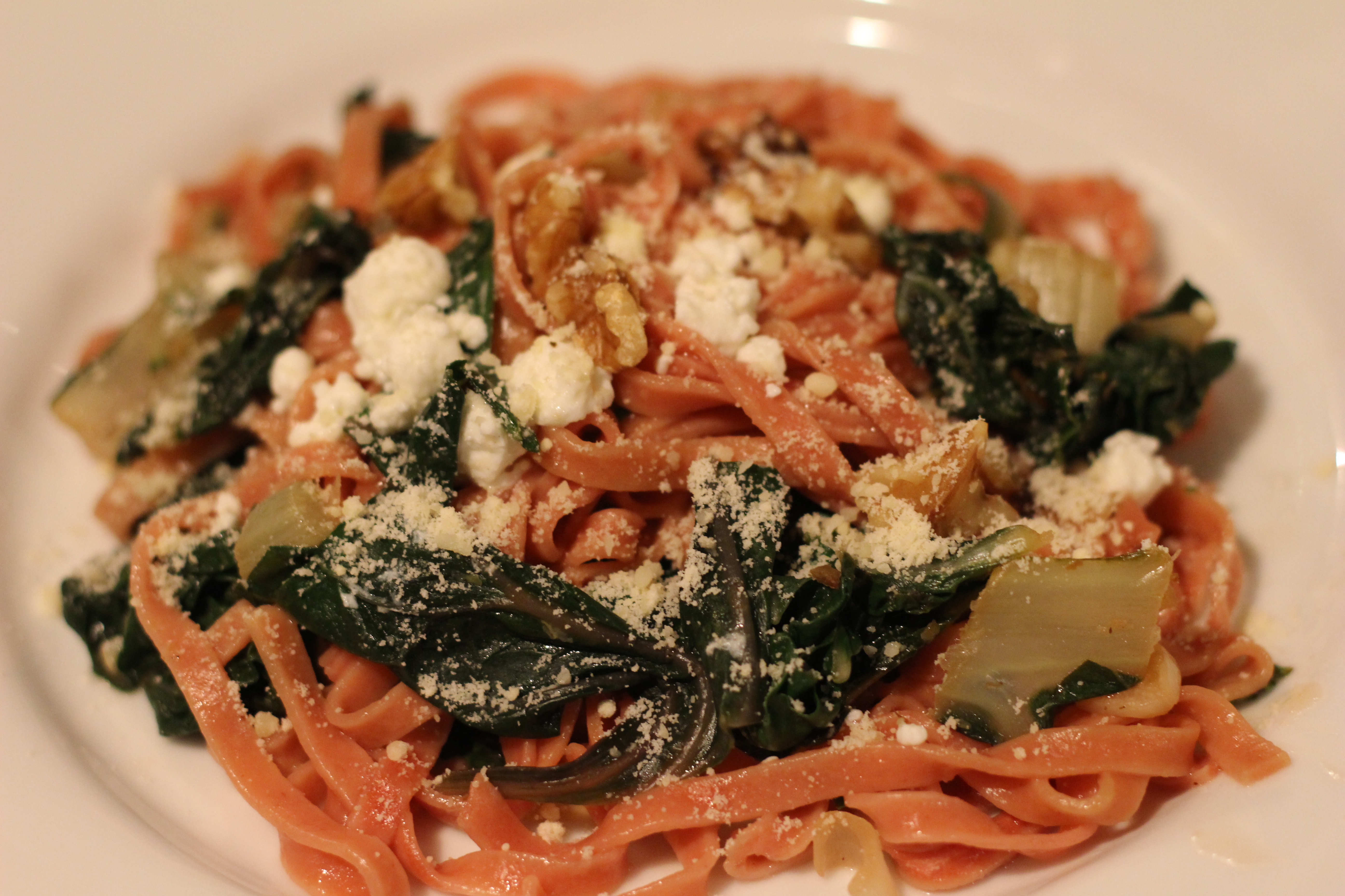 Fresh Beet Linguini with Goat Cheese, Swiss Chard and Toasted Walnuts: A Blue Apron Review